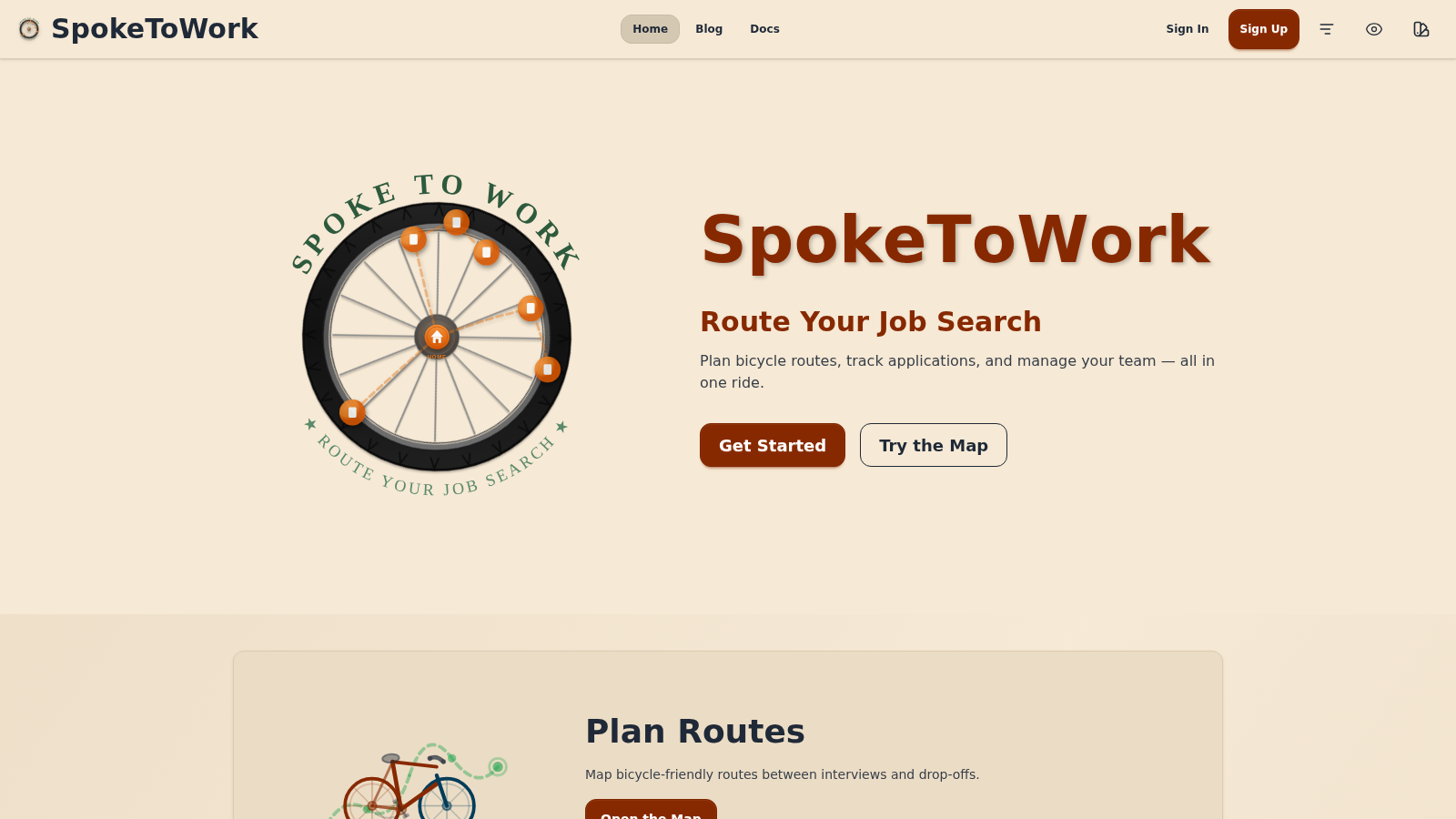 SpokeToWork is a Progressive Web App built with Next.js and MapLibre GL that lets users plot companies on an interactive map, generate optimized cycling routes between them, manage job applications, and exchange end-to-end encrypted messages using ECDH shared-secret cryptography — all while working offline.